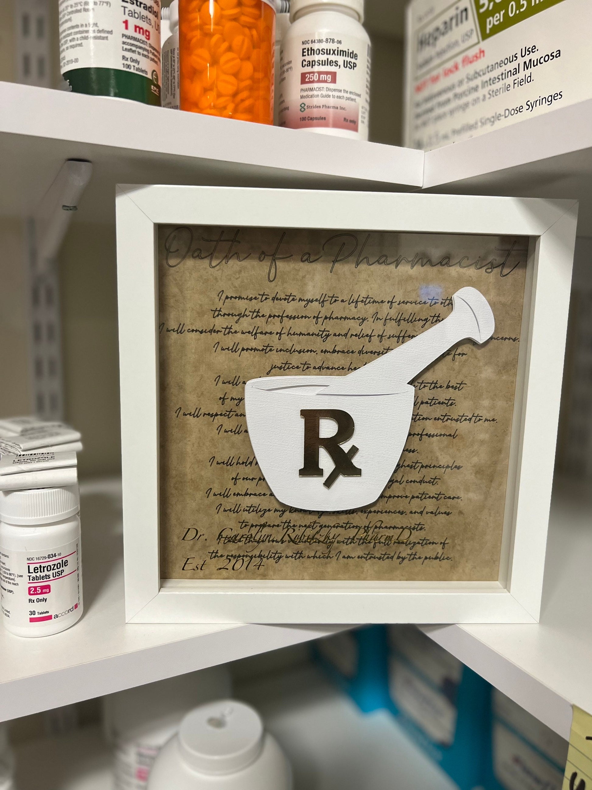 This listing is for 1 8"x8" frame. The backing is the 2021 Oath of a Pharmacist and the front glass includes personalization of pharmacist name, year established/retired. I am happy to include the place of work or pharmacy school at no additional cost. I can also replace the school and year with a short quote such as "Mentor, Leader, Pharmacist." Please feel free to message me if you want to run through ideas.